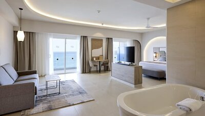 In these rooms, you will find one super king size bed (200x200 cm), a comfortable sofa in the lounge, air conditioning, a ceiling fan, satellite TV, a safe, a minibar, a drinks dispenser, a coffee maker and a balcony or terrace with incredible views of the Caribbean Sea.